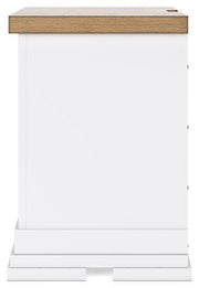 Casual style with substance. This two-tone nightstand raises the bar on comfortably cozy design in your soothing sanctuary. A sturdy silhouette with a classic white finish and black metal hardware exudes modern farmhouse vibes. The butcher block oak veneer top adds a relaxed aesthetic. And bedside charging for your go-to devices is made easy with power outlets and USB ports.