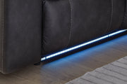 This reclining sectional pairs the luxe look of faux leather with must-have functional features. LED lights on the underside put a modern twist on the simply chic design—choose from three colors to add ambiance to movie night or gaming with friends. And you can keep remotes, drinks and other entertainment essentials close with the handy console. Ready to relax? Easy pull tab reclining has you stretched out in no time.