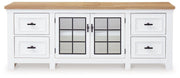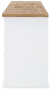 Casual style with substance. This two-tone TV stand raises the bar on comfortably cozy design. A sturdy silhouette with a butcher block oak veneer top, classic white finish and contemporary black metal hardware exudes modern farmhouse vibes. The spacious cabinet, display shelves and drawers let you tuck away entertainment essentials while displaying treasures in this charmingly curated piece. Cutouts for wire management help keep the look relaxed and uncluttered.